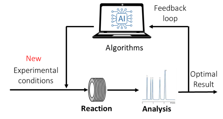 Figure 1. (Left) scheme of the feedback loop for autonomous AI driven optimization. (Right) Prof. Felpin’s set-up for autonomous flow optimization.