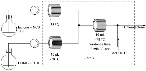 Flow chemistry offered a robust alternative, allowing precise control over the residence time of the reaction mixture, independent of batch size. In our experimental setup (scheme 2 and picture 1), a first feed consisting of a solution of lactone and NCS in dry THF under nitrogen atmosphere was pumped and a second feed consisting of a solution of LiHMDS in dry THF under nitrogen atmosphere was pumped at the same flow rate. The two feeds were cooled to -78 °C then merged in a T-shaped mixing unit. The combined mixture was passed through a cooled reactor at -78°C for the appropriate residence time. After the reactor, the mixture was merged in a T-shaped mixing unit with a mixture of THF/AcOH allowing the quench of the reaction. The solution was then finally collected at room temperature. After optimization, side-product formation was efficiently suppressed by maintaining strict residence time control at low temperature followed by rapid quenching of the reaction stream. Furthermore, the straightforward scalability brought by flow chemistry enabled a productivity greater than 5g per hour. This approach ensured reproducible yields, with the desired product obtained in up to 87% yield, compared to only 21–27% under batch scale-up conditions, thereby establishing flow chemistry as a viable and scalable route for this transformation.