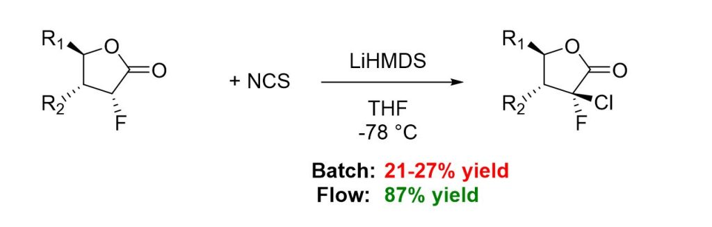 In the standard batch procedure, a solution of lithium bis(trimethylsilyl)amide (LiHMDS) is added dropwise at low temperature to a mixture of the lactone and NCS under strictly anhydrous conditions. However, the resulting α-chloro-fluorolactone is highly sensitive to bases, which promotes the formation of undesired side products. Upon scale-up, the prolonged addition time of the base solution further exacerbates this issue, leading to reduced yields and poor reproducibility.